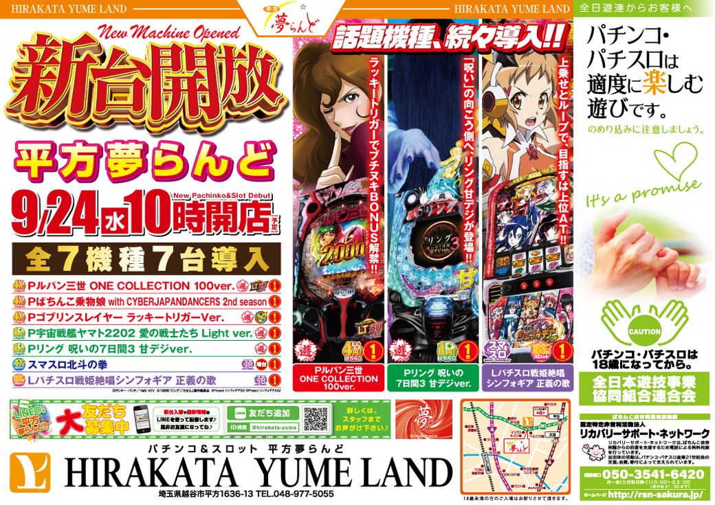 【平方夢らんど】9/24(水) 新 台 入 替 全7機種7台導入!