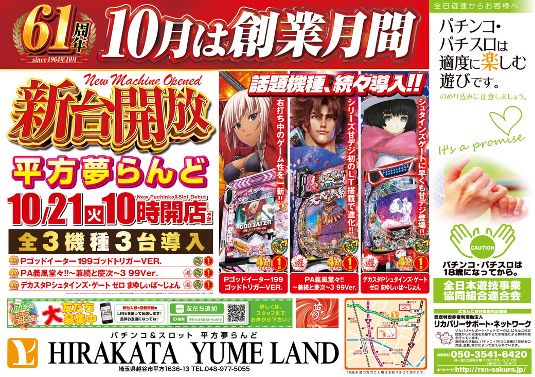 【平方夢らんど】10/21(火) 新 台 入 替 全3機種3台導入!
