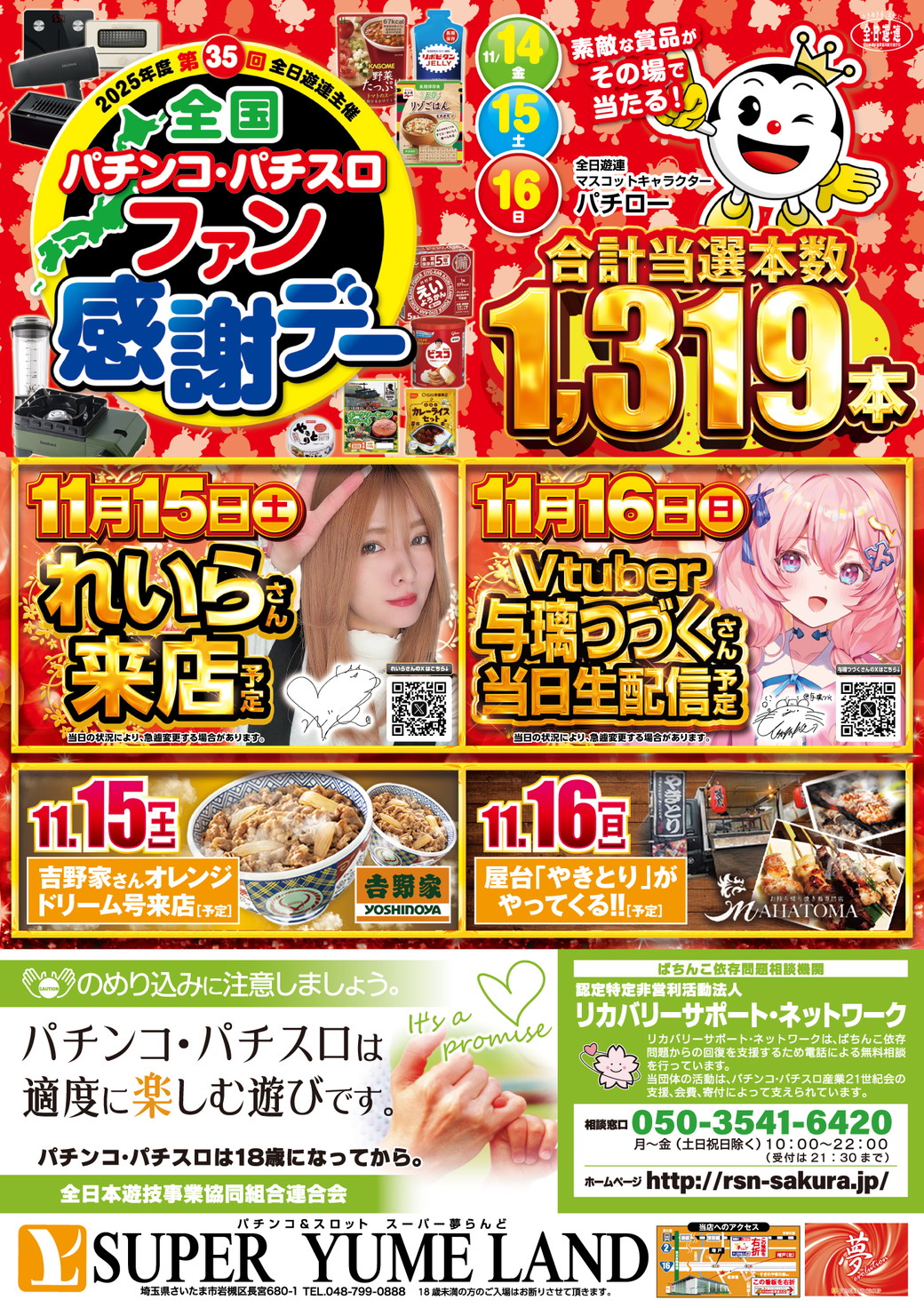 【スーパー夢らんど】11/14(金)より3日間ファン感謝デー開催!