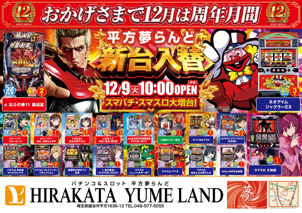 【平方夢らんど】12/9(火) 新 台 入 替 スマパチ・スマスロ大増台!